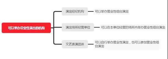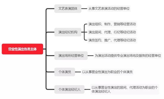 《营业性演出管理条例》(“《条例》”)和《营业性演出管理条例实施细则》(“《实施细则》”)是针对营业性演出的主要规定,根据该等规定,涉及营业性演出的主体大致如下: